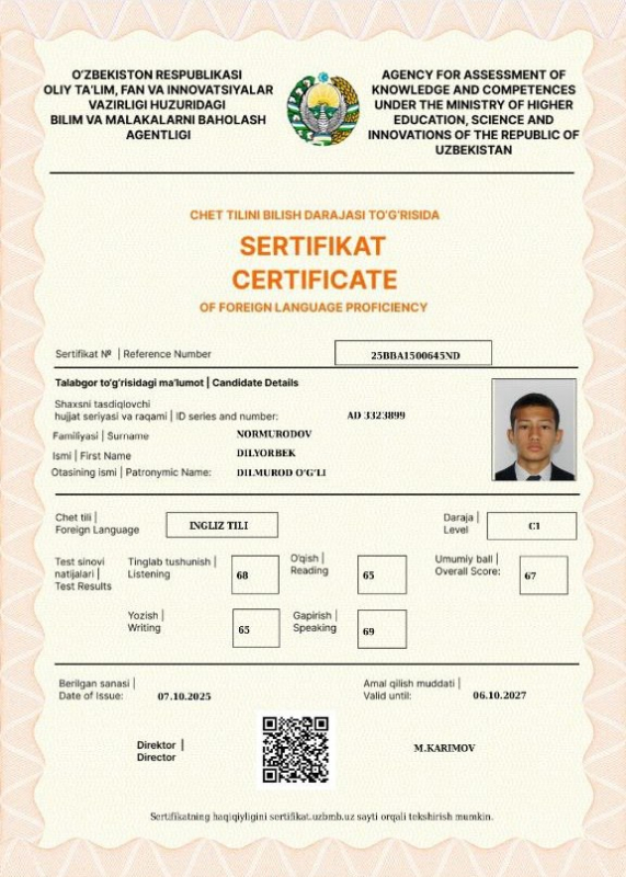 ✨ Jumladan 10A-01 sinf o'quvchisi Normurodov Dilyorbek Dilmurod o'g'li CEFR imtihonidan muvaffaqiyatli o'tdi va SERTIFIKATni yangiladi.